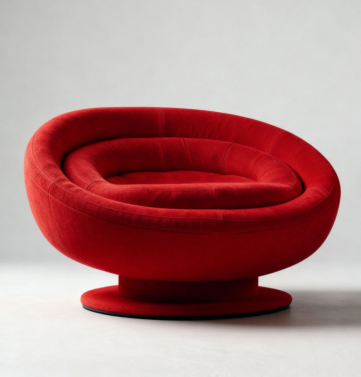 The circular nesting volumes suggest organic growth, a topology of comfort engineered through the logic of repetition and compression. It embodies bold optimism through organic form, expressive colour and tactile comfort. The enveloping silhouette is an upholstered landscape that invites the body to sink and recline. The vivid upholstery underscores its sculptural presence. Resting on a discreet circular base, the chair appears to hover, enhancing its sense of weightless futurity. The execution with precise seams, generous proportions, and refined upholstery shows prime craftsmanship. Deauville stands at the intersection of comfort and spectacle: it celebrates softness, sensuality, and the pleasure of inhabiting form.