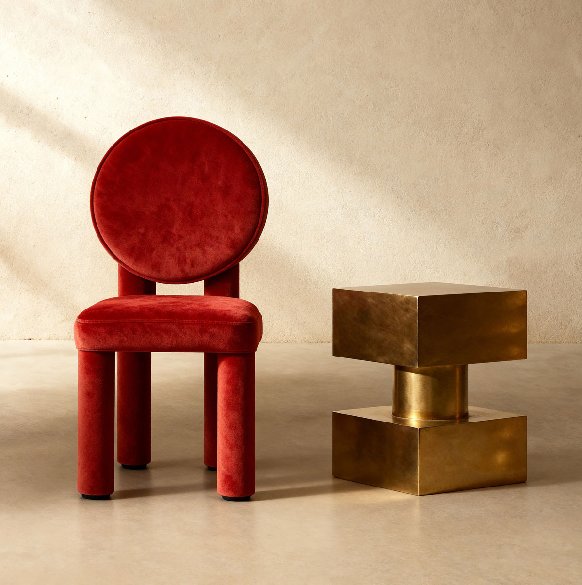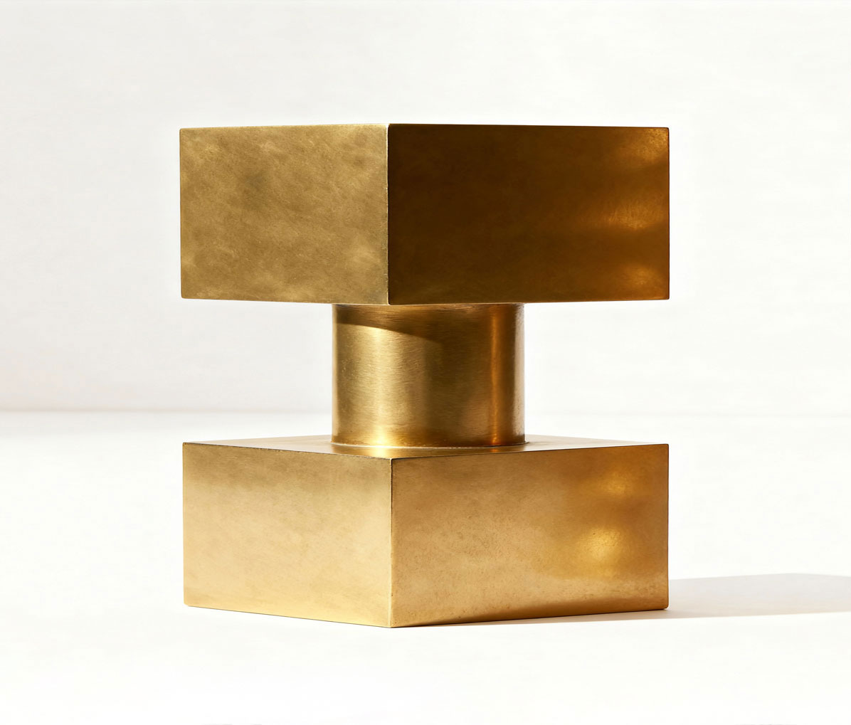 A study in sculptural minimalism, coffee table Duro is composed of two brass cubes balanced on a central cylindrical core. The design plays with mass, proportion, and visual tension. The stacked composition suggests both stability and levitation. The hand-polished finish enhances the table’s architectural presence, with subtle variations in the brass surface capturing and diffusing light. This luminous patina gives the piece warmth and depth, allowing it to shift character throughout the day, from a softly glowing object in ambient light to a bold, reflective form under direct illumination.