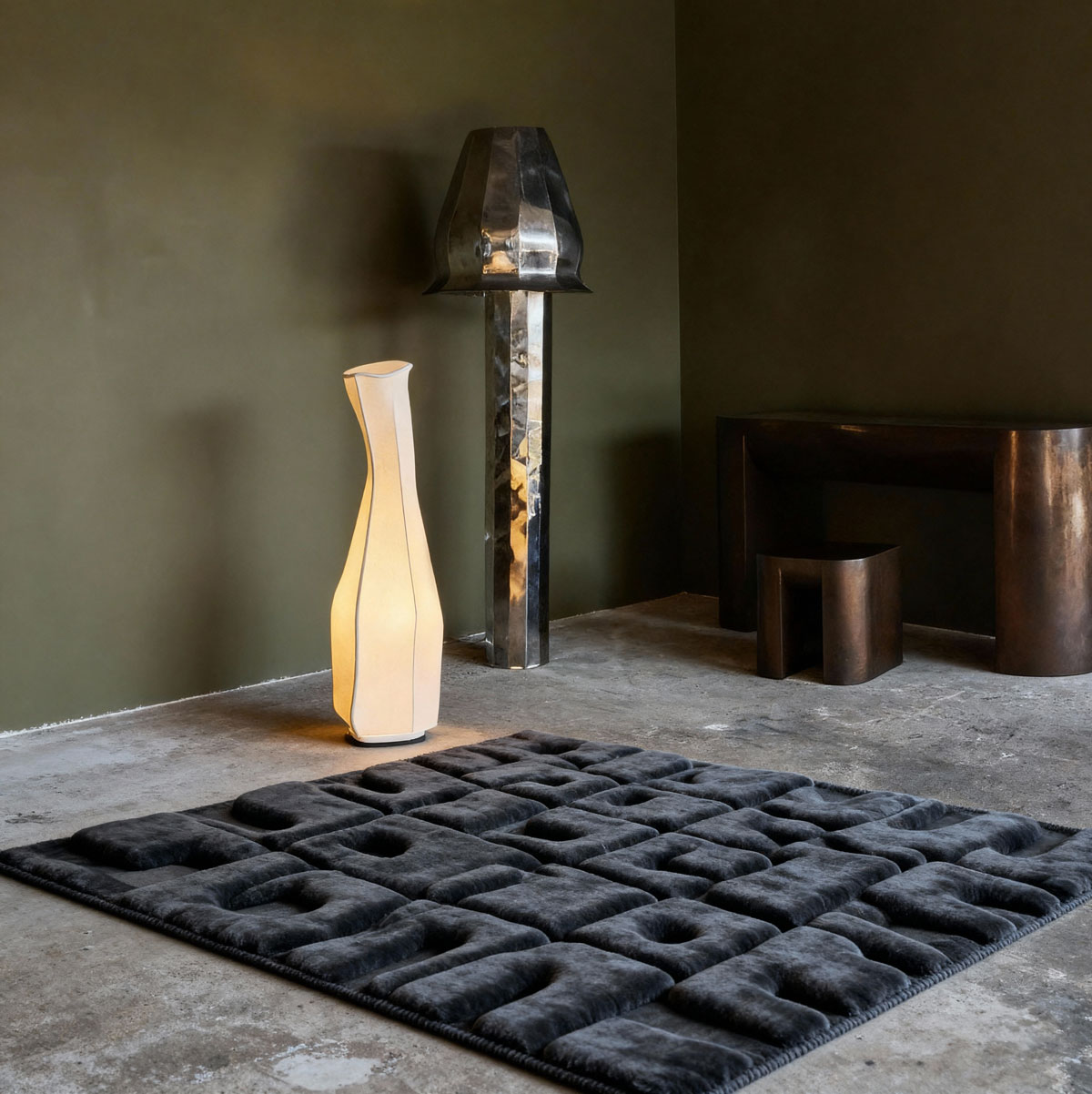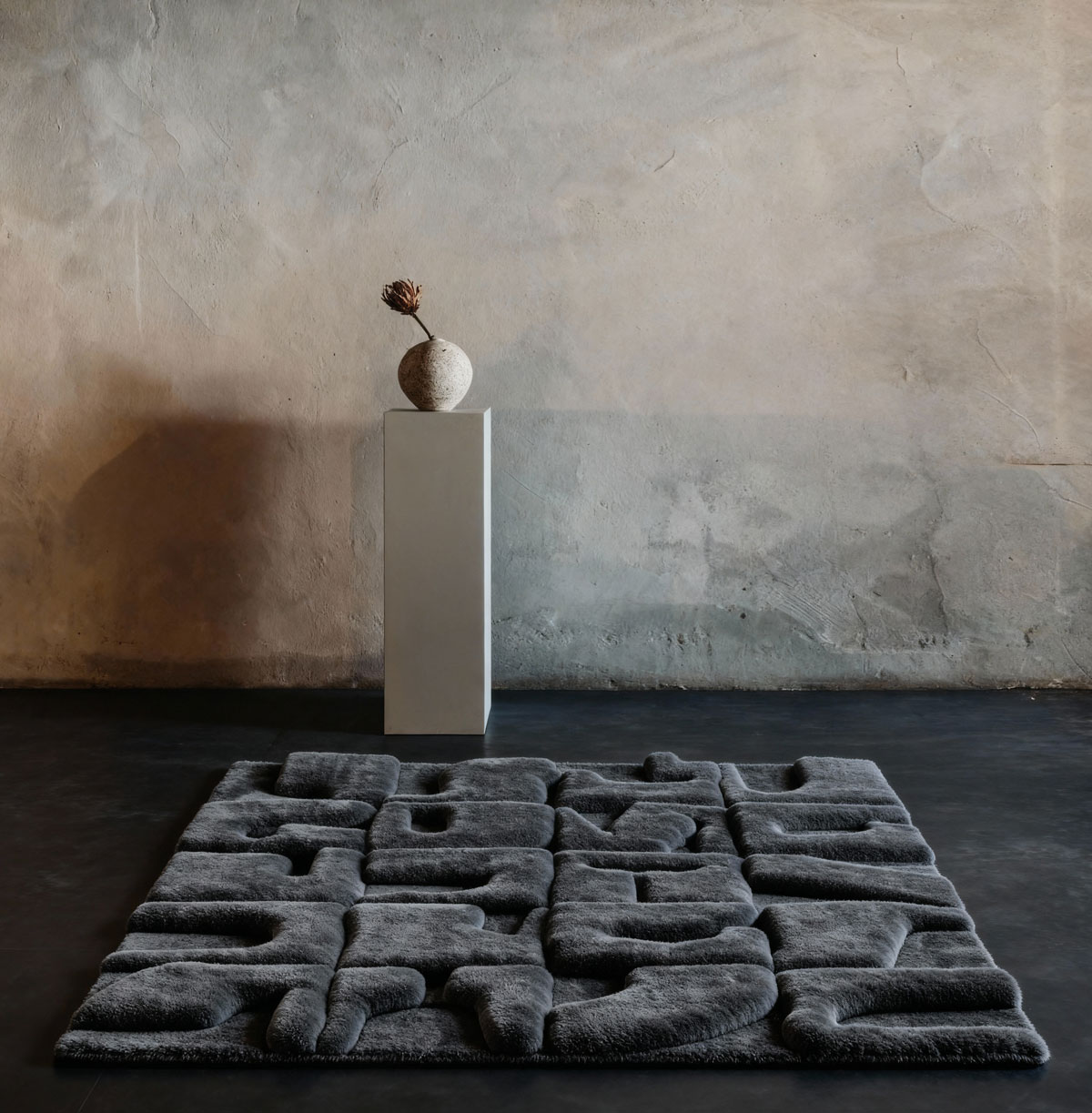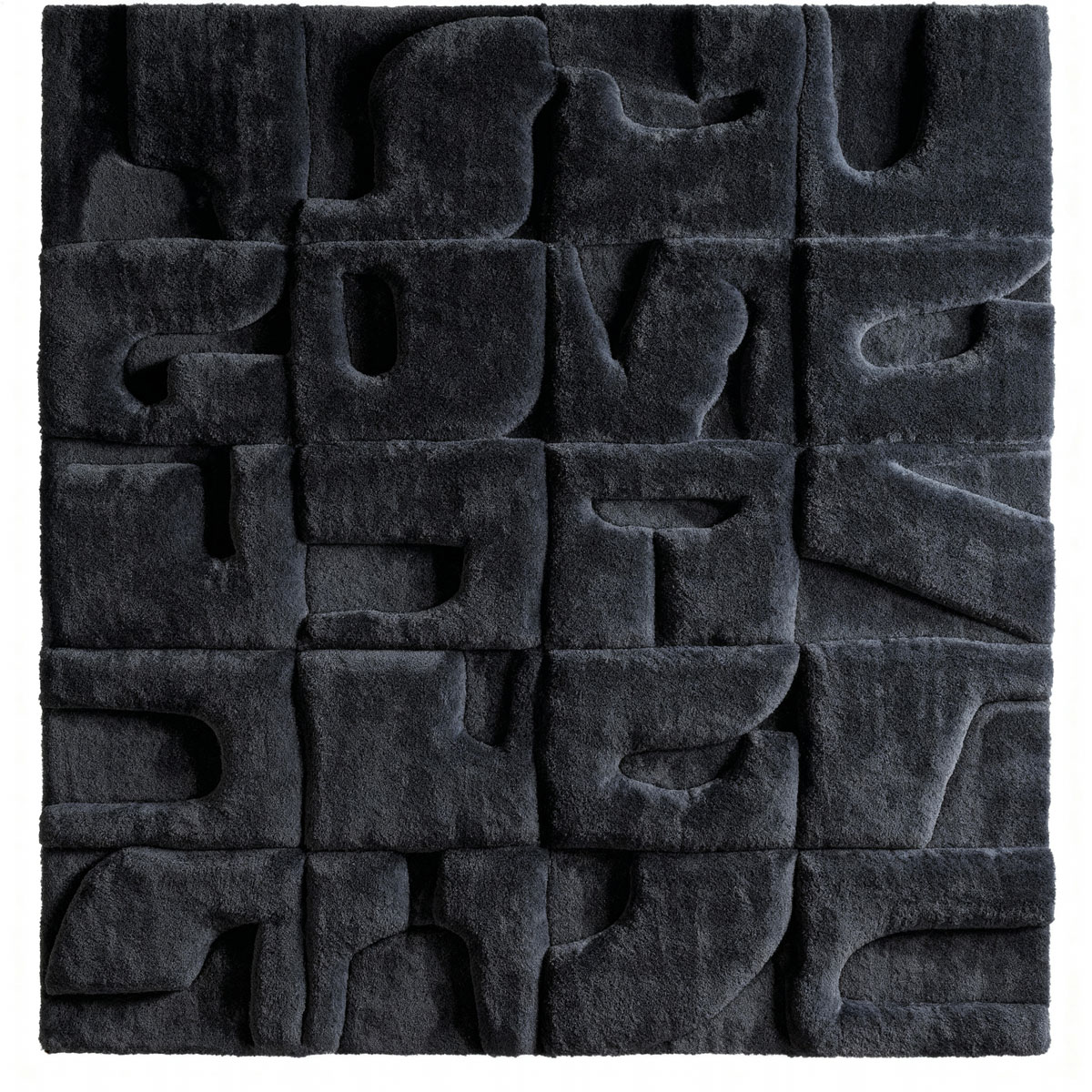 This sculptural rug transforms the floor into a tactile landscape, merging textile craft with architectural intention. Its surface is composed of modular, relief-like forms that evoke abstract typography. Each block presents an interplay of concavity and protrusion, creating shifting shadows that animate the rug as light moves across it. The deep charcoal palette enhances its monolithic character, allowing texture rather than colour to define its presence. Hand-tufted with a dense, velvety pile, the rug invites touch while maintaining a distinctly sculptural discipline. The overall effect is both graphic and atmospheric: a functional textile that behaves like a low-lying bas-relief. Ideal for contemporary interiors, this piece operates as an artwork underfoot: commanding space through depth, rhythm, and material sophistication.. Handmade by De Caldes artisans in New Zealand wool with a hint of Viscose.