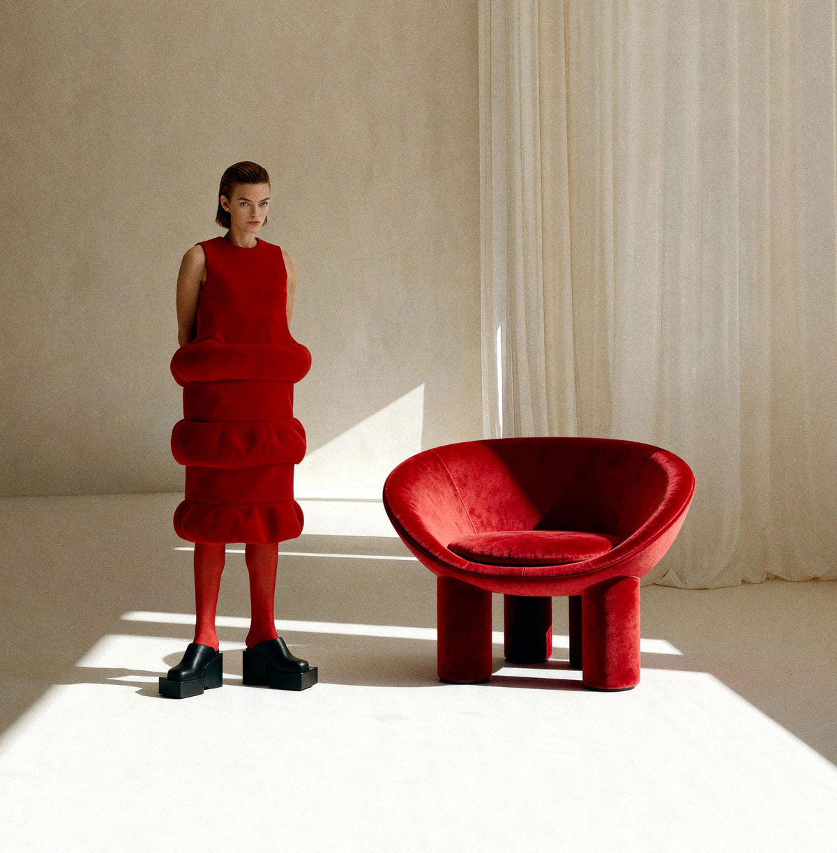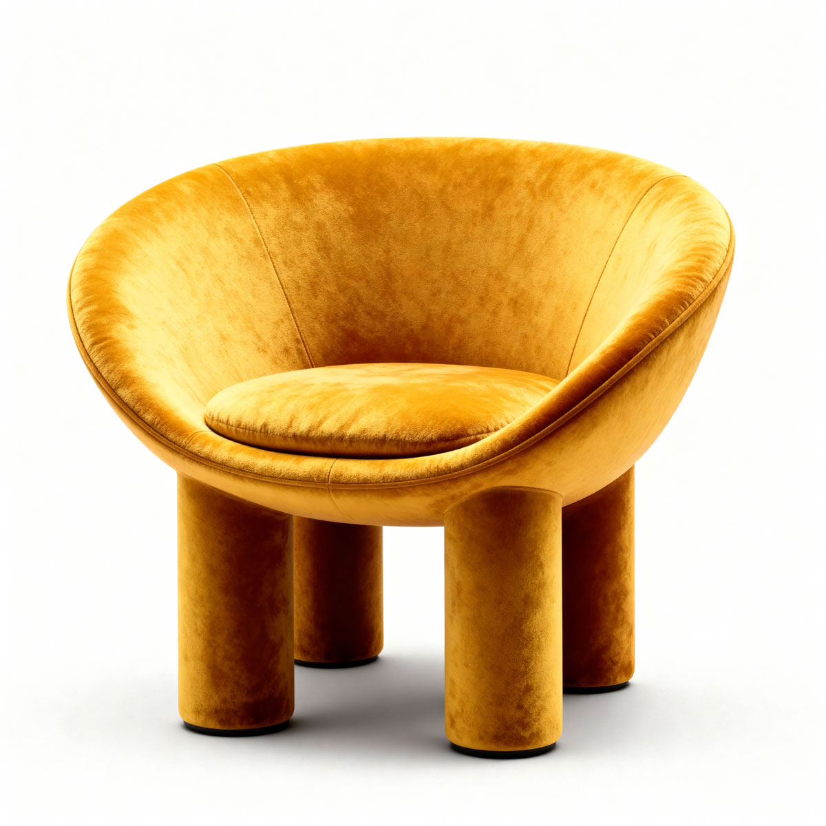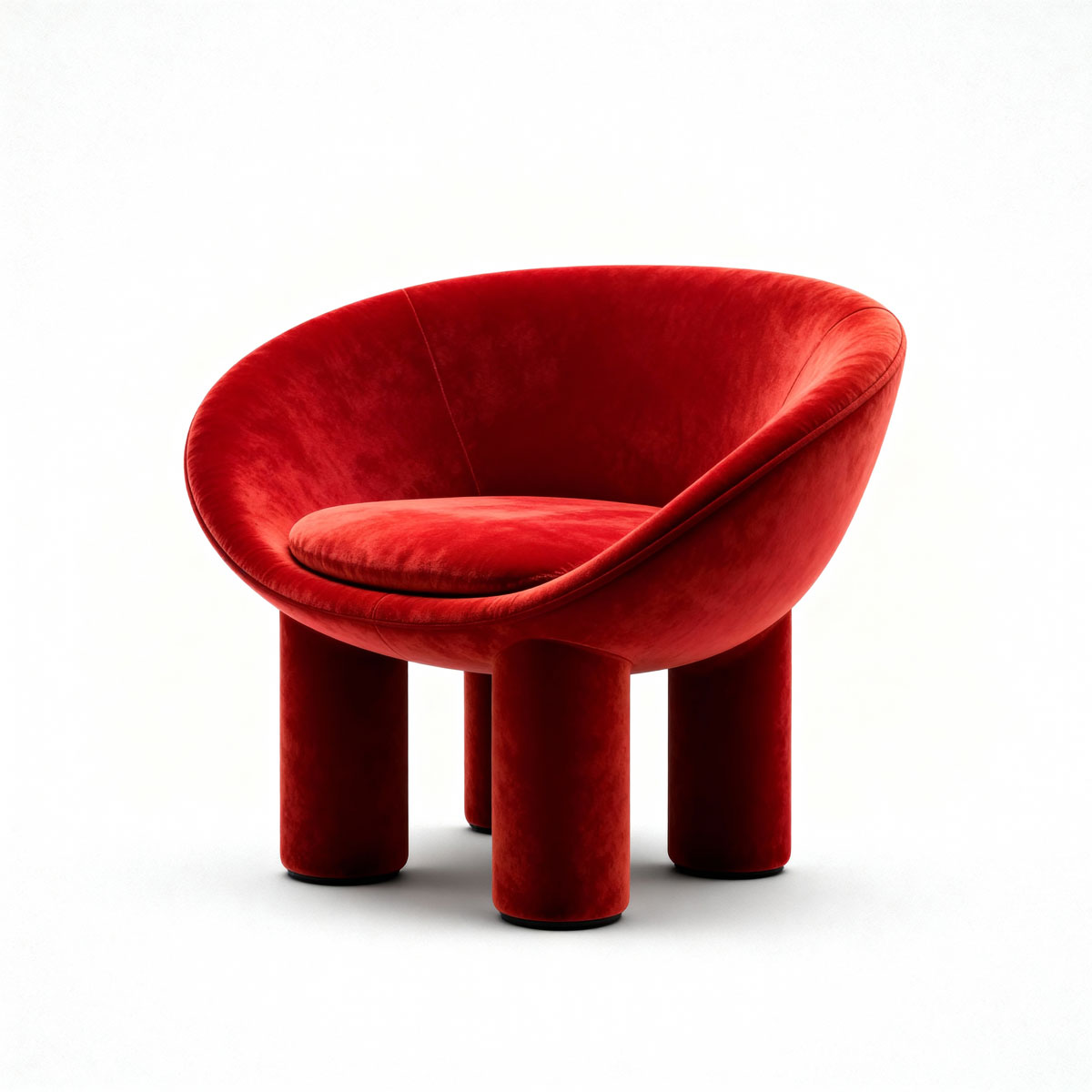 Alaia presents a bold, monolithic silhouette, playing masterfully with tension between weighty presence and apparent buoyancy. The semi-spherical bowl appears almost to float despite the chunky legs, creating an intriguing visual paradox. It is a cocoon for enveloping comfort.