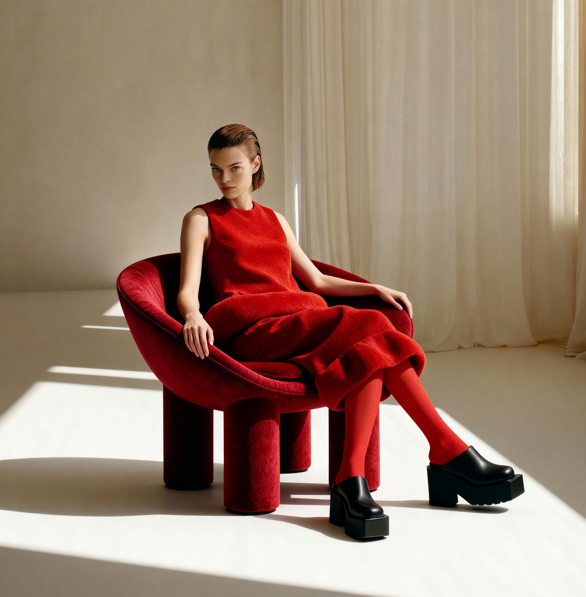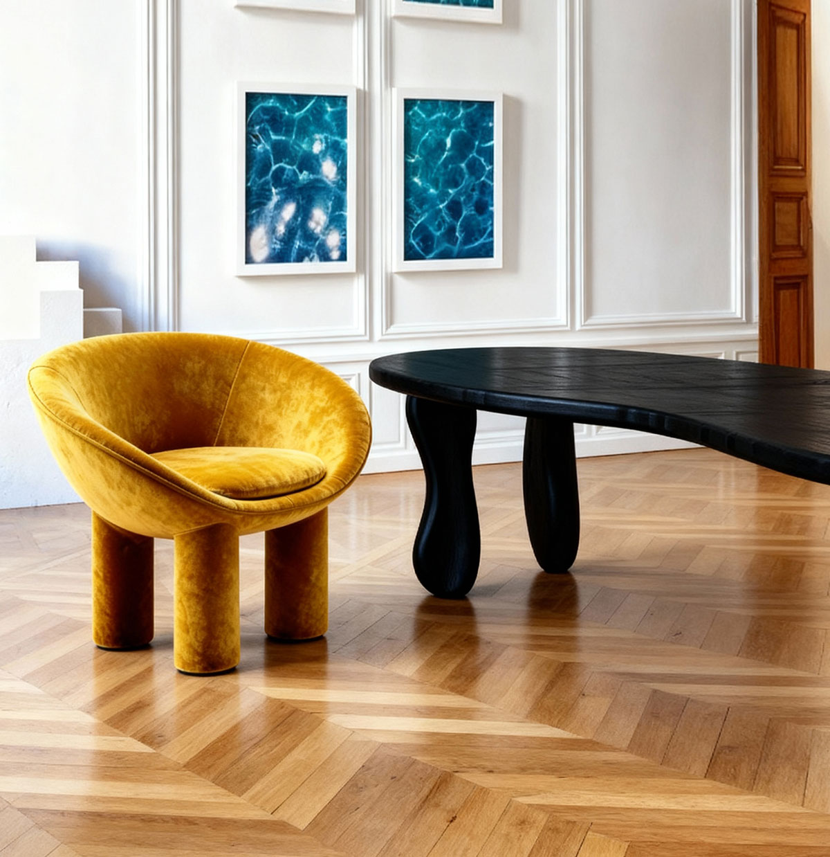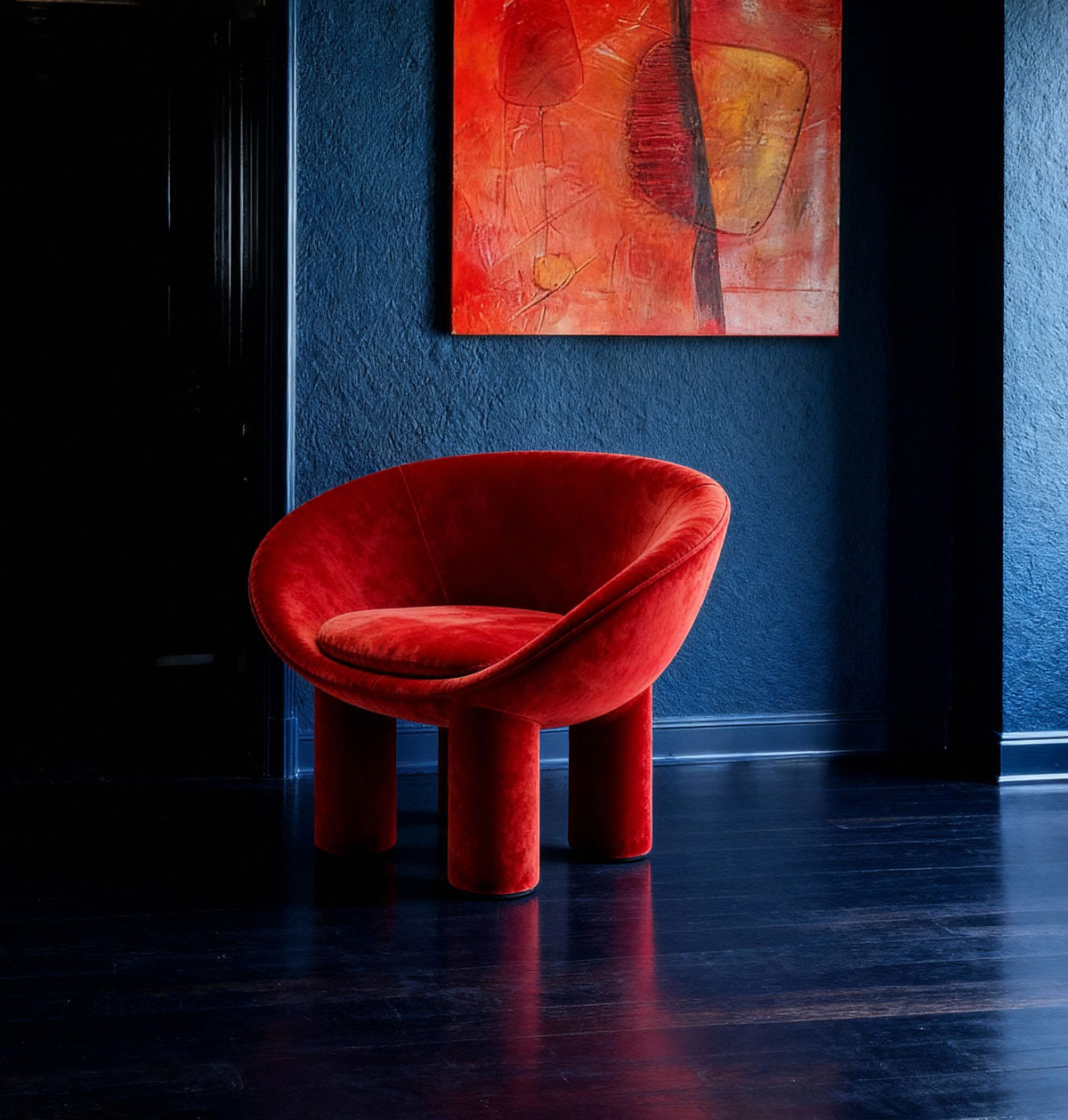 Alaia presents a bold, monolithic silhouette, playing masterfully with tension between weighty presence and apparent buoyancy. The semi-spherical bowl appears almost to float despite the chunky legs, creating an intriguing visual paradox. It is a cocoon for enveloping comfort.
