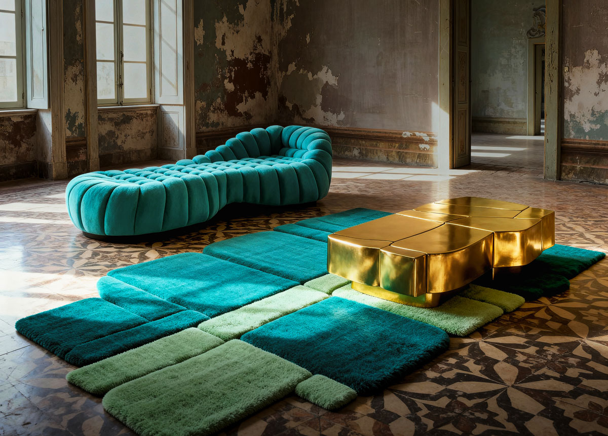In this brass couch table, form and material coalesce into a statement of sculptural opulence. Recalling an ice shelf or a plate of volcanic rock, its brass surface engages the surrounding light, transforming the table into a mutable presence, animated by its environment. Brass, historically associated with ceremonial and domestic grandeur, infuses the piece with a sense of permanence and luxury, while its archaic visual quality keeps it from feeling static. Its low, grounded stance evokes the horizontality of Japanese chabudai, placing emphasis on a communal, earthbound mode of gathering. The subtly articulated base creates a levitation effect, granting the mass a surprising lightness.