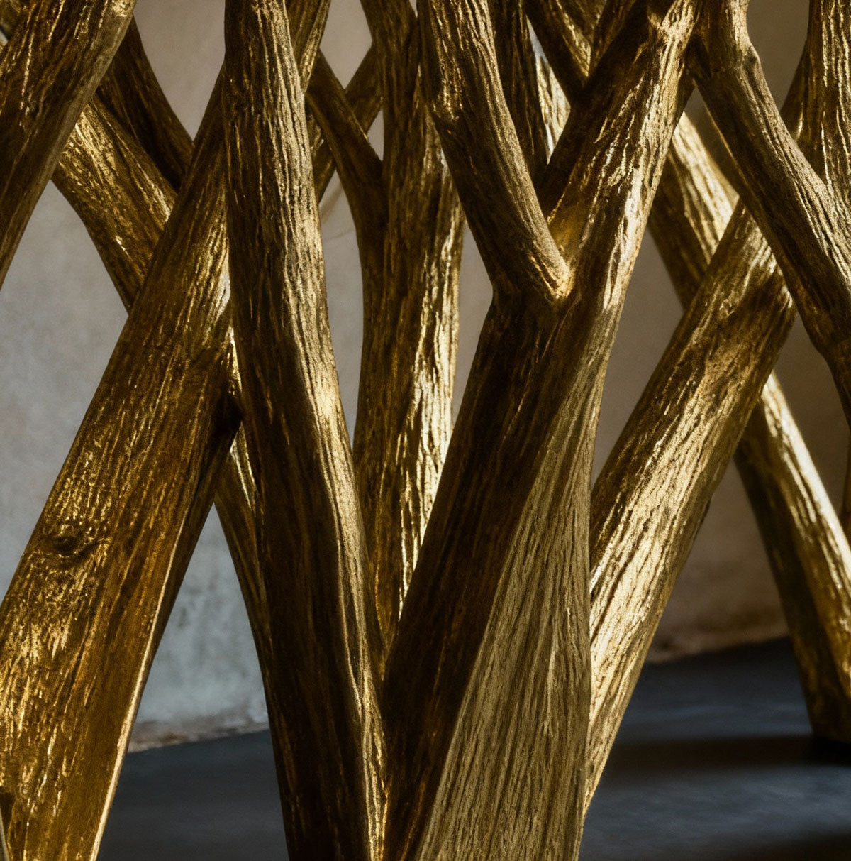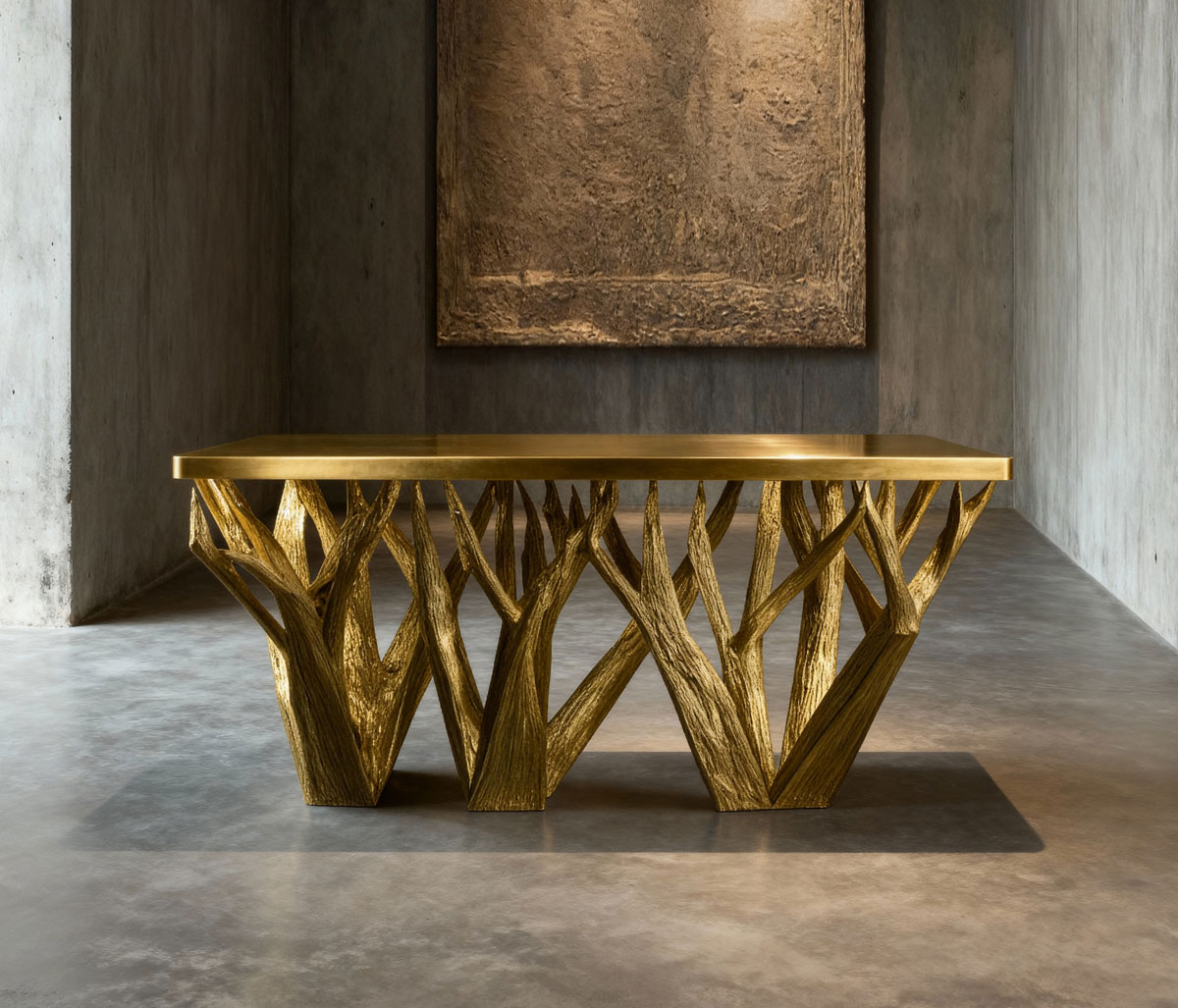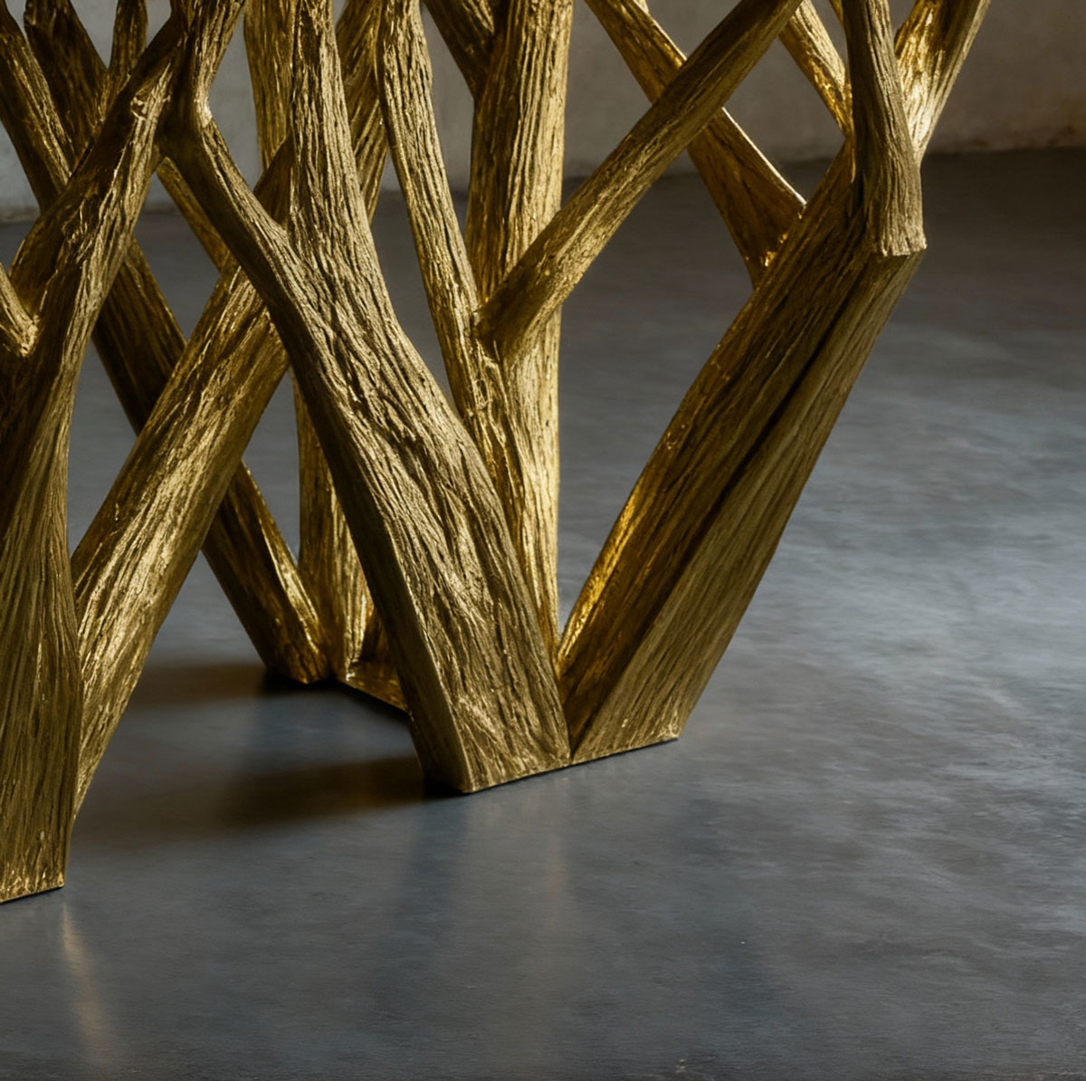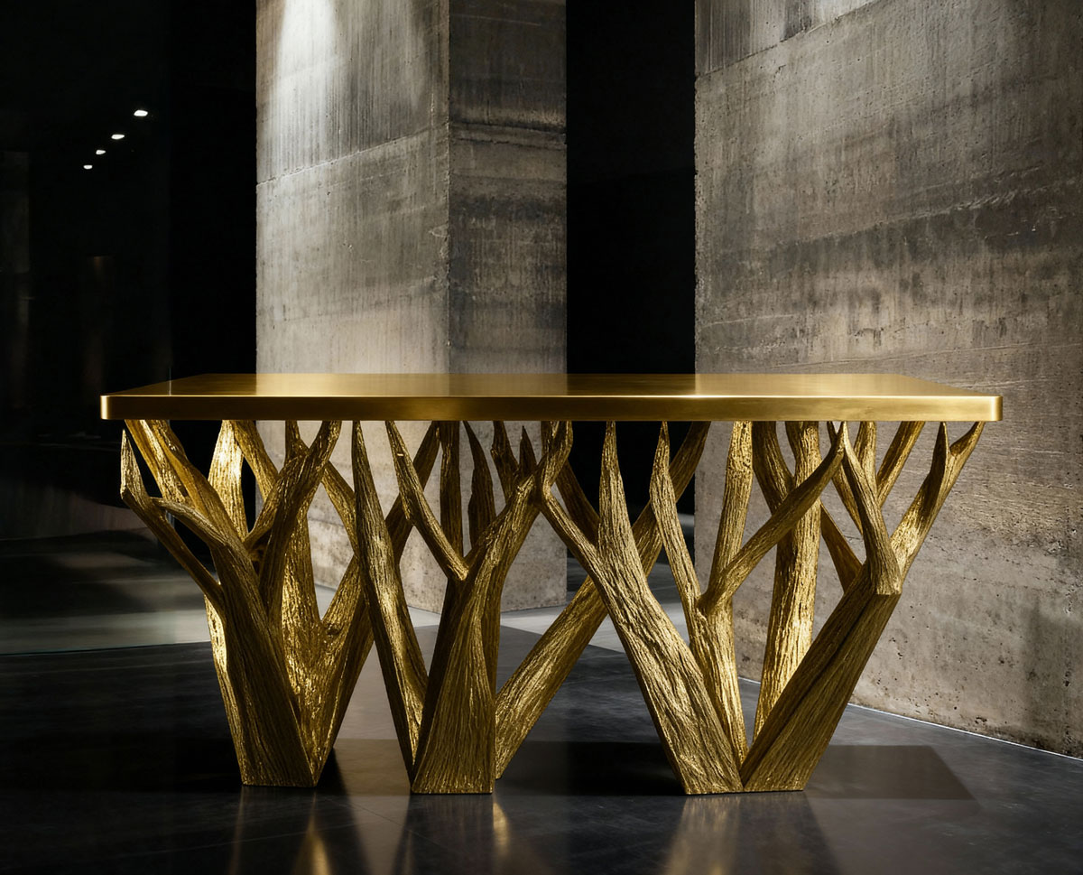 The base of the console, composed of branching, tree-like forms, evokes a forest canopy, an organic architecture to support the top. Each branch is textured with hand-tooled striations, capturing the irregularity and vitality of natural wood rendered in radiant brass. The interplay of light across the faceted surfaces animates the piece, shifting from soft glows to sharp highlights as one moves around it. Despite its intricate silhouette, the console maintains a balanced, contemporary clarity, merging artisanal craftsmanship with a bold sculptural presence.