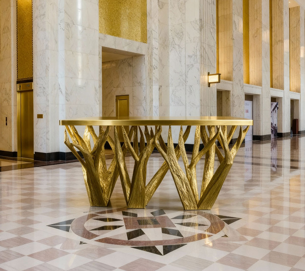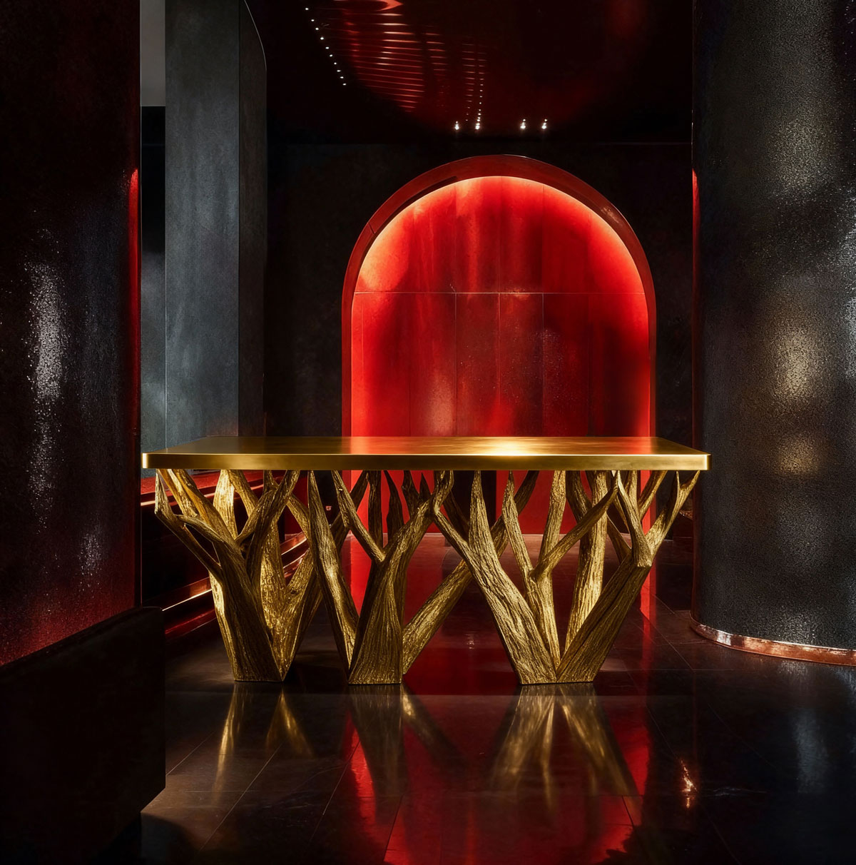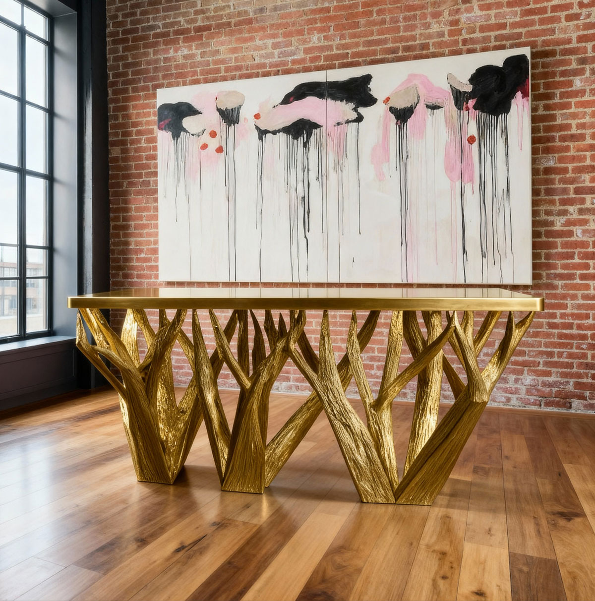 The base of the console, composed of branching, tree-like forms, evokes a forest canopy, an organic architecture to support the top. Each branch is textured with hand-tooled striations, capturing the irregularity and vitality of natural wood rendered in radiant brass. The interplay of light across the faceted surfaces animates the piece, shifting from soft glows to sharp highlights as one moves around it. Despite its intricate silhouette, the console maintains a balanced, contemporary clarity, merging artisanal craftsmanship with a bold sculptural presence.
